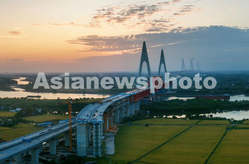 图片说明:2024年10月20日,位于安徽省马鞍山市的巢马城际铁路马鞍山长江公铁大桥副汊航道桥建设场景。