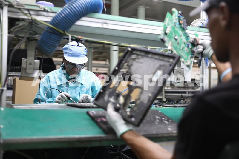 图片说明:2024年4月2日,南非海信家电工业园,工人在电视生产线上工作。