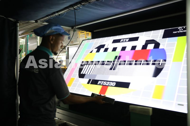 图片说明:2024年4月2日,南非海信家电工业园,工人在电视生产线上工作。