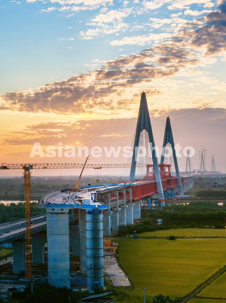 图片说明:2024年10月20日,位于安徽省马鞍山市的巢马城际铁路马鞍山长江公铁大桥副汊航道桥建设场景。