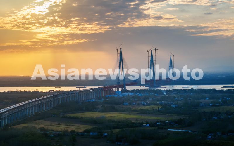 图片说明:2024年10月20日,位于安徽省马鞍山市的巢马城际铁路马鞍山长江公铁大桥主汊航道桥建设场景。