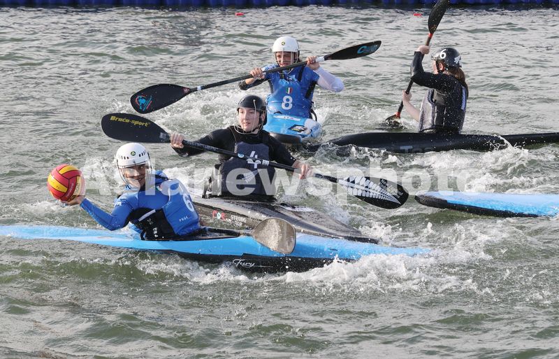 2024年10月20日,在浙江省湖州市德清县凤栖湖,参加2024国际划联皮艇球世界锦标赛成人女子组决赛的新西兰队和意大利队在比赛中拼抢。