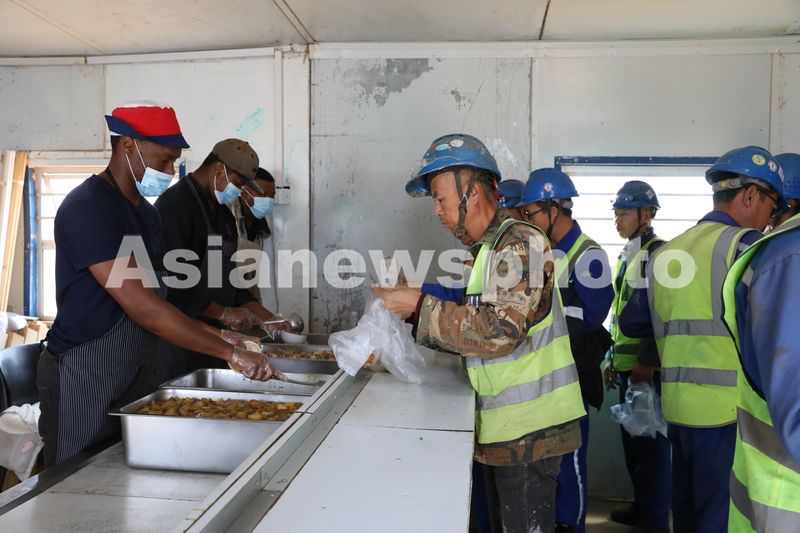 2024年4月4日,正在建设中的南非红石100兆瓦塔式熔盐光热电站项目施工现场,中方工人排队打午饭。