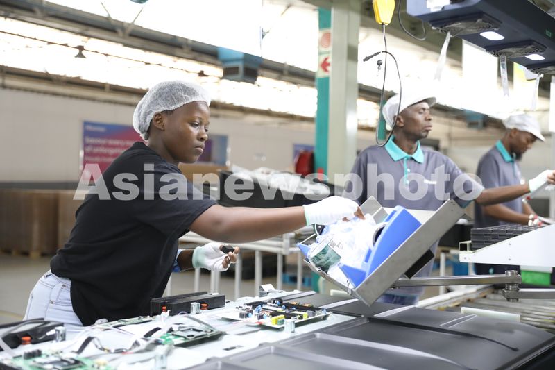 图片说明:2024年4月2日,南非海信家电工业园,工人在电视生产线上工作。