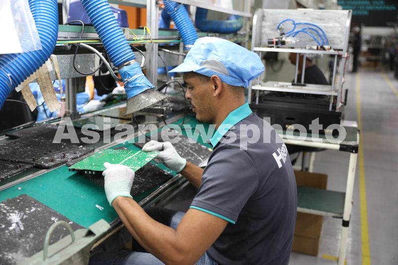 图片说明:2024年4月2日,南非海信家电工业园,工人在电视生产线上工作。