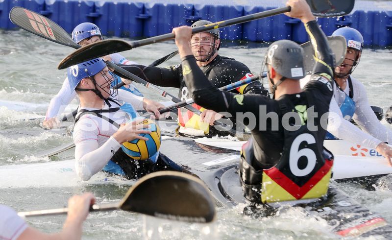 2024年10月20日,在浙江省湖州市德清县凤栖湖,参加2024国际划联皮艇球世界锦标赛成人男子组决赛的德国队和法国队在比赛中拼抢。