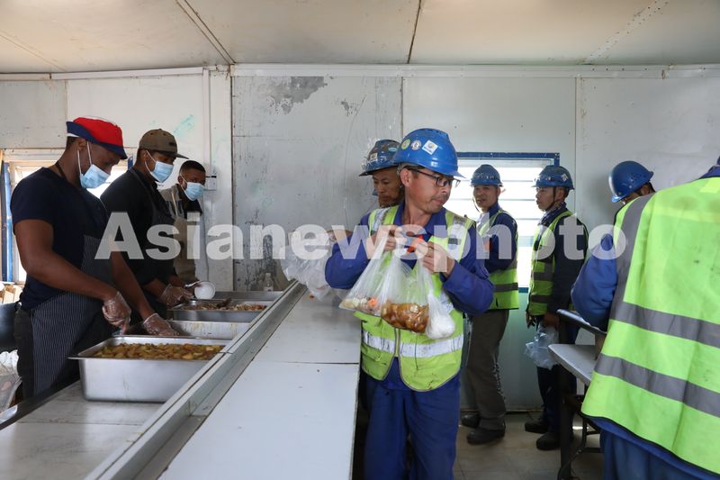 2024年4月4日,正在建设中的南非红石100兆瓦塔式熔盐光热电站项目施工现场,中方工人排队打午饭。