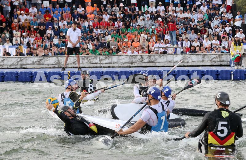 2024年10月20日,在浙江省湖州市德清县凤栖湖,参加2024国际划联皮艇球世界锦标赛成人男子组决赛的德国队和法国队在比赛中拼抢。
