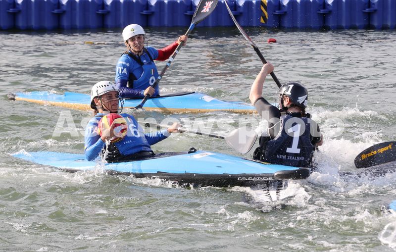 2024年10月20日,在浙江省湖州市德清县凤栖湖,参加2024国际划联皮艇球世界锦标赛成人女子组决赛的新西兰队和意大利队在比赛中拼抢。