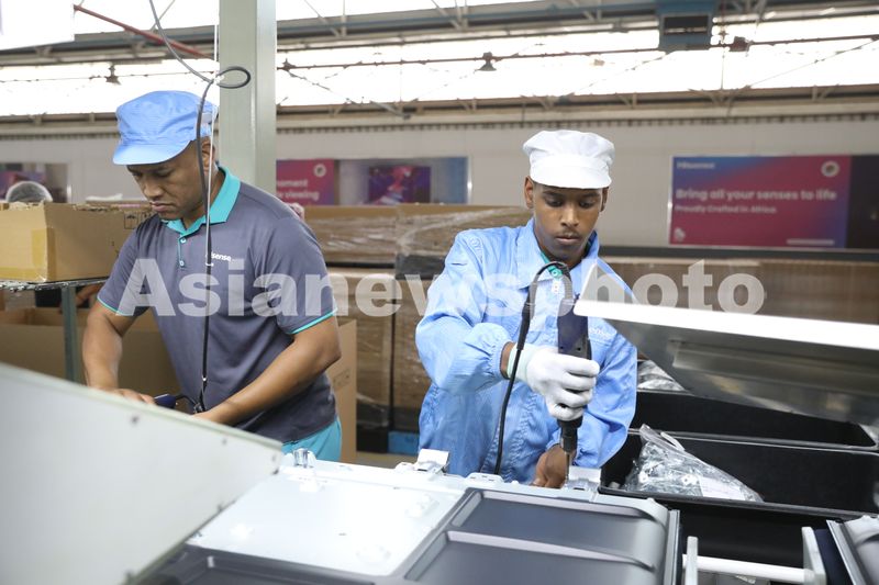 图片说明:2024年4月2日,南非海信家电工业园,工人在电视生产线上工作。