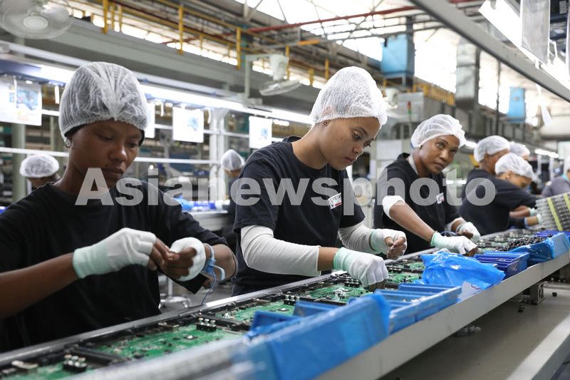 图片说明:2024年4月2日,南非海信家电工业园,工人在电视生产线上工作。
