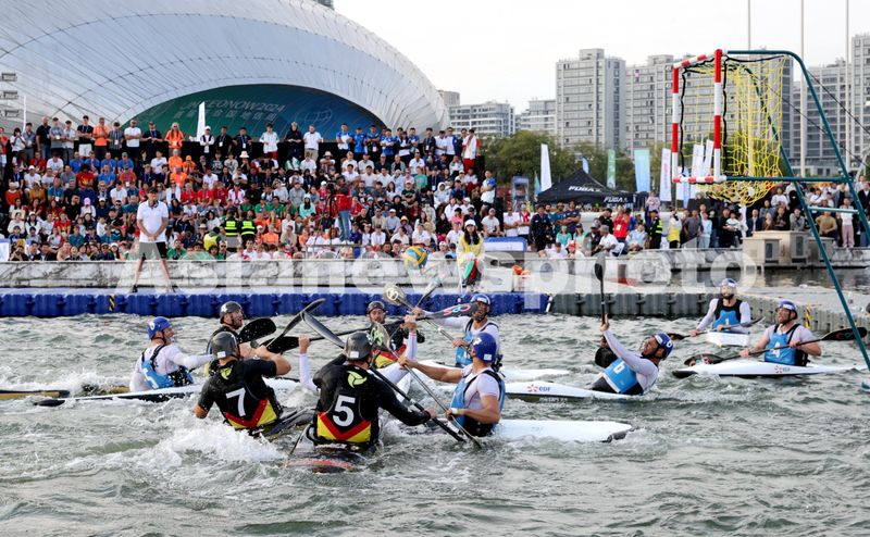 2024年10月20日,在浙江省湖州市德清县凤栖湖,参加2024国际划联皮艇球世界锦标赛成人男子组决赛的德国队和法国队在比赛中拼抢。