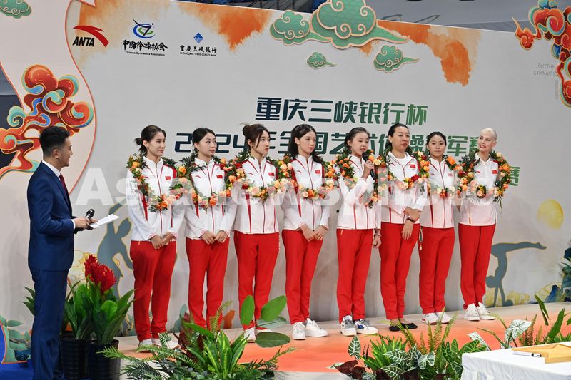 2024年10月19日,重庆大学(虎溪校区)体育中心,2024全国艺术体操冠军赛开赛仪式现场,巴黎奥运会艺术体操集体全能冠军丁欣怡、郭崎琪、黄张嘉洋、王澜静、郝婷以及国家艺术体操队集体组教练组长孙丹,教练许颜书、安娜塔西娅的惊喜亮相。