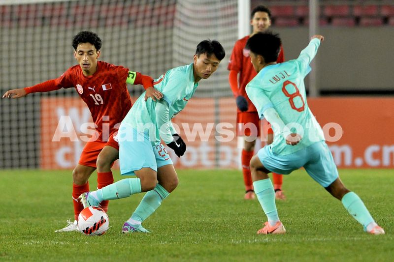 2024年10月19日,身着荧光绿球衣的中国球员与红色球衣巴林球员在大连普湾体育场拼抢。