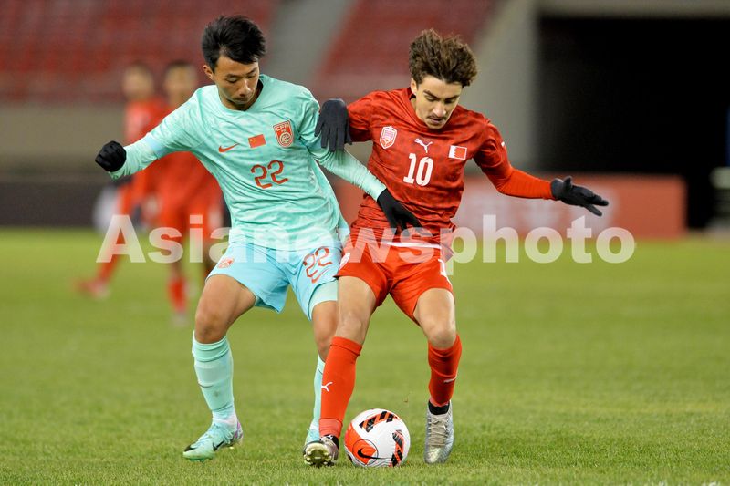 2024年10月19日,身着荧光绿球衣的中国球员与红色球衣巴林球员在大连普湾体育场拼抢。