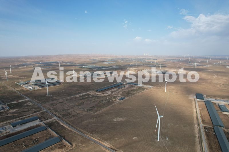 图片说明:2024年10月14日,俯瞰宁夏回族自治区灵武市白土岗乡一处戈壁滩上,一排排风力发电机源源不断地往外输送绿色能源。