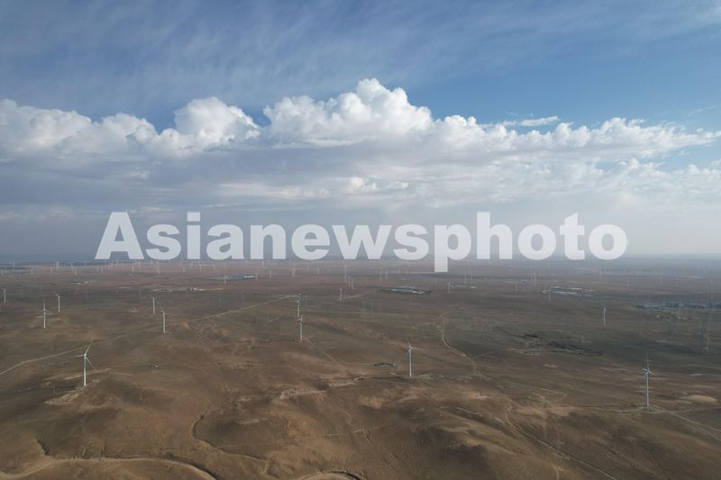 图片说明:2024年10月14日,俯瞰宁夏回族自治区灵武市白土岗乡一处戈壁滩上,一排排风力发电机源源不断地往外输送绿色能源。