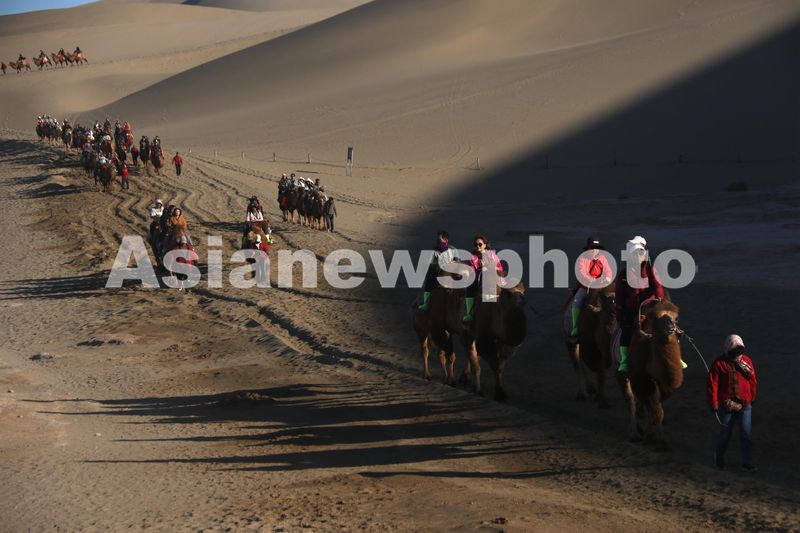 2024年10月21日,游客在甘肃省敦煌市鸣沙山月牙泉景区游览。