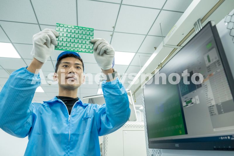 图片说明:2024年10月22日,在安徽省合肥庐阳经济开发区辖区安徽鼎立网络科技有限公司,技术人员正在对应用于智慧社区领域的中控电路板智能传感器进行生产研发。