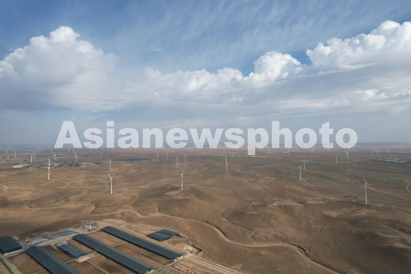 图片说明:2024年10月14日,俯瞰宁夏回族自治区灵武市白土岗乡一处戈壁滩上,一排排风力发电机源源不断地往外输送绿色能源。