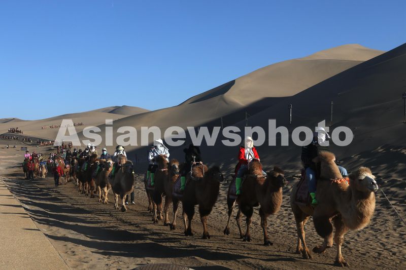 2024年10月21日,游客在甘肃省敦煌市鸣沙山月牙泉景区游览。