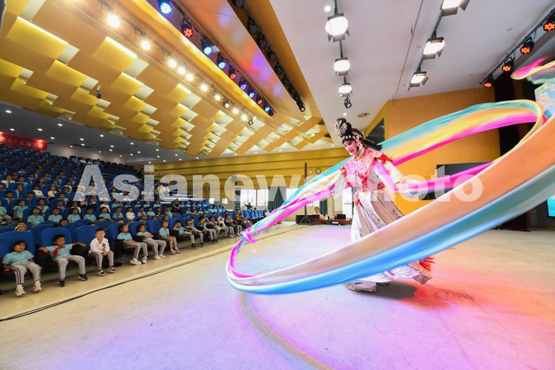 2024年10月22日,浙江省金华市“婺风遗韵·五进五送”婺剧折子戏校园专场,在金华市东苑小学演出,浙江婺剧艺术研究院演员在表演婺剧《天女散花》。