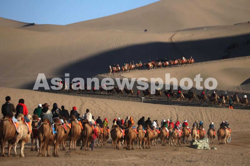 2024年10月21日,游客在甘肃省敦煌市鸣沙山月牙泉景区游览。