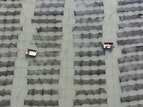 2024年10月23日,在江苏省连云港市赣榆区沿海水域的“海上菜园”里,紫菜养殖户在忙碌。
