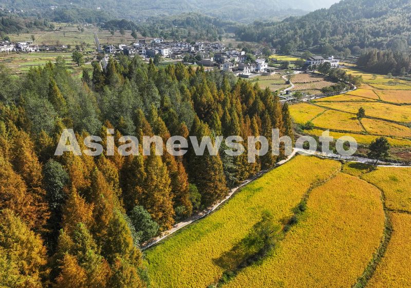 图片说明:2024年10月23日,安徽省黄山市黟县宏村拍摄的秋日田园风光。(无人机照片)
