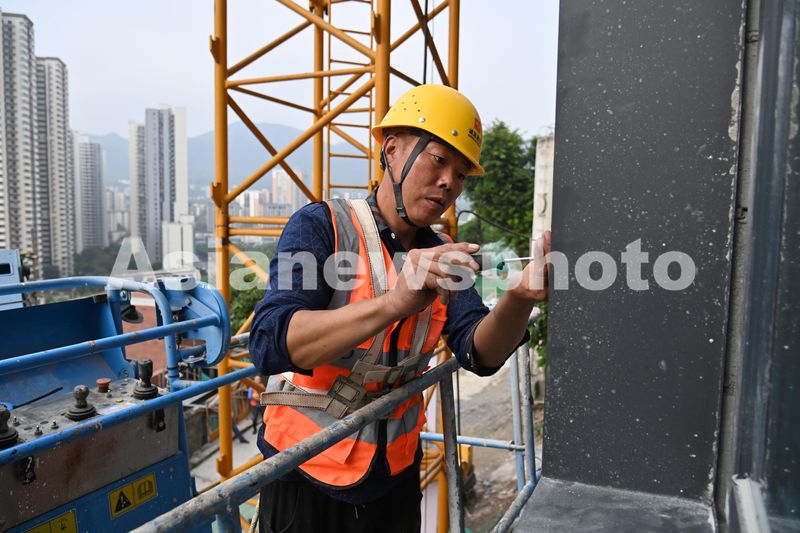 2024年10月24日,重庆市沙坪坝区磁器口凤凰山城市更新项目,工人正在进行建筑外立面施工。