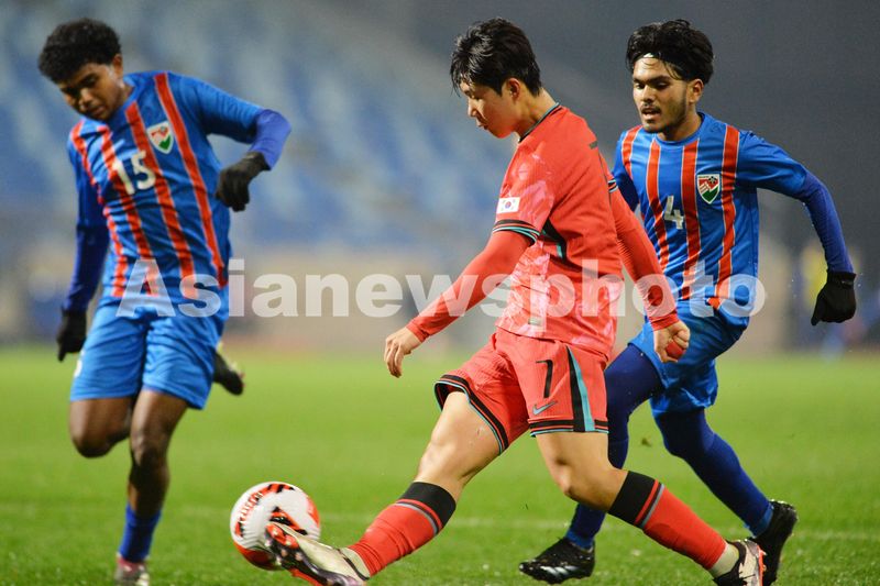 2024年10月23日,身着红色球衣的韩国球员与马尔代夫球员在大连足球青训基地足球场上拼抢。当晚,在大连足球青训基地体育场进行的2025亚足联U17亚洲杯预选赛C组赛第三轮,韩国队以13-0大胜马尔代夫。
