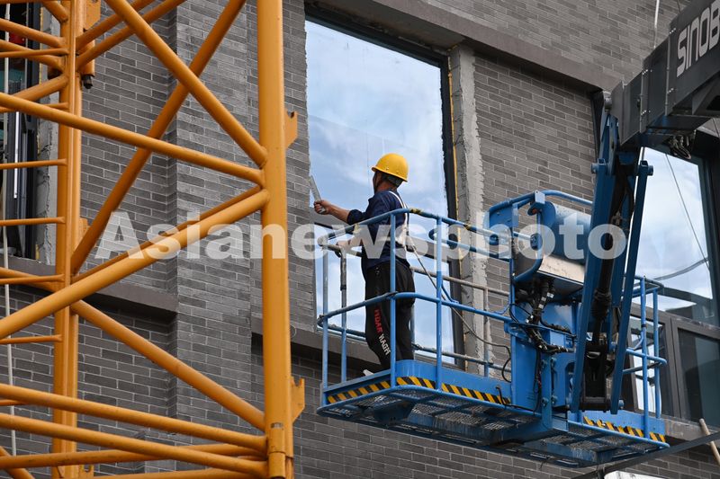 2024年10月24日,重庆市沙坪坝区磁器口凤凰山城市更新项目,工人正在进行建筑外立面施工。