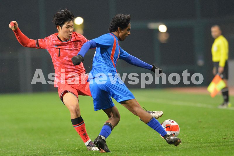 2024年10月23日,身着红色球衣的韩国球员与马尔代夫球员在大连足球青训基地足球场上拼抢。当晚,在大连足球青训基地体育场进行的2025亚足联U17亚洲杯预选赛C组赛第三轮,韩国队以13-0大胜马尔代夫。