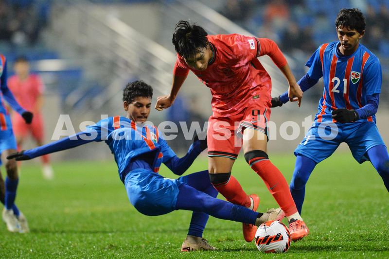 2024年10月23日,身着红色球衣的韩国球员与马尔代夫球员在大连足球青训基地足球场上拼抢。当晚,在大连足球青训基地体育场进行的2025亚足联U17亚洲杯预选赛C组赛第三轮,韩国队以13-0大胜马尔代夫。
