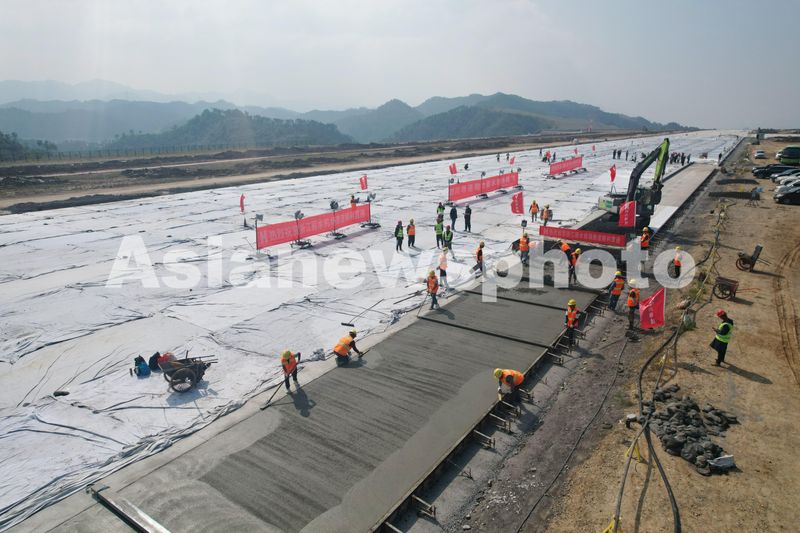 图片说明:2024年10月24日,施工人员在浙江丽水机场飞行跑道最后一片施工区域进行跑道混凝土铺平作业。