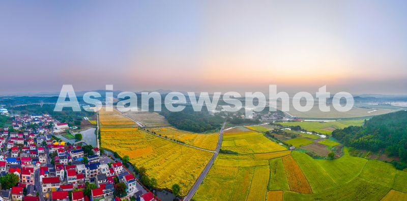 图片说明:2024年10月24日,江苏省南京市溧水区晶桥镇笪村,金黄的稻田与整齐的村落构成一幅美丽画卷,稻田飘香丰收在望。