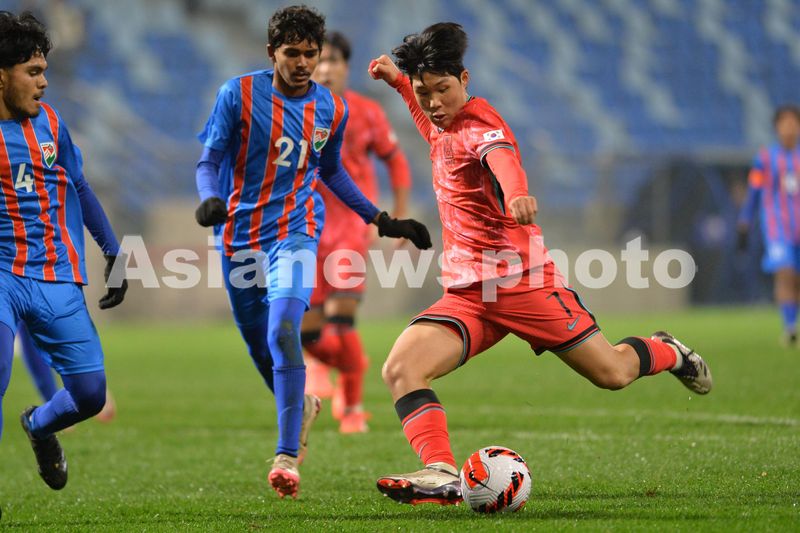 2024年10月23日,身着红色球衣的韩国球员与马尔代夫球员在大连足球青训基地足球场上拼抢。当晚,在大连足球青训基地体育场进行的2025亚足联U17亚洲杯预选赛C组赛第三轮,韩国队以13-0大胜马尔代夫。