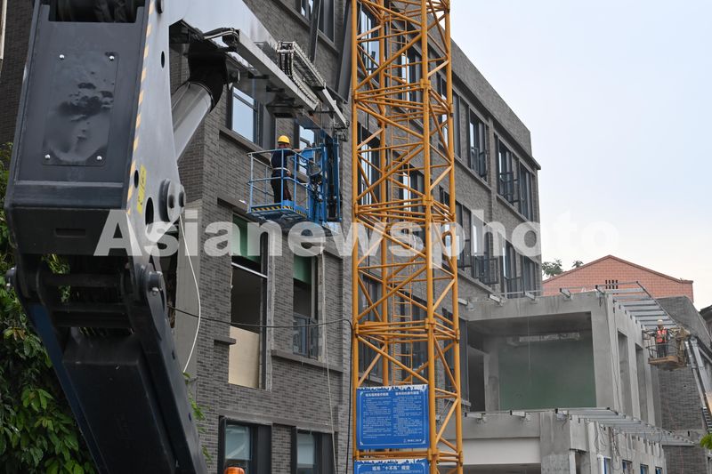2024年10月24日,重庆市沙坪坝区磁器口凤凰山城市更新项目工人正在进行建筑外立面金属幕墙的施工。