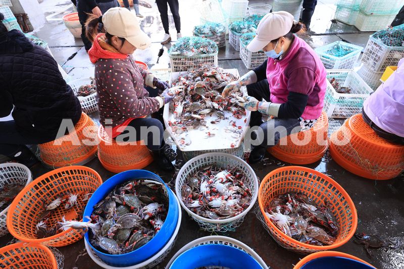 图片说明:2024年10月24日,在江苏省连云港市赣榆区海头镇海产品交易市场,渔民在分拣鲜活梭子蟹。