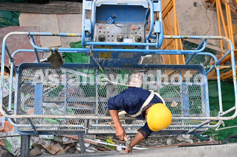 2024年10月24日,重庆市沙坪坝区磁器口凤凰山城市更新项目,工人正在进行建筑外立面施工。