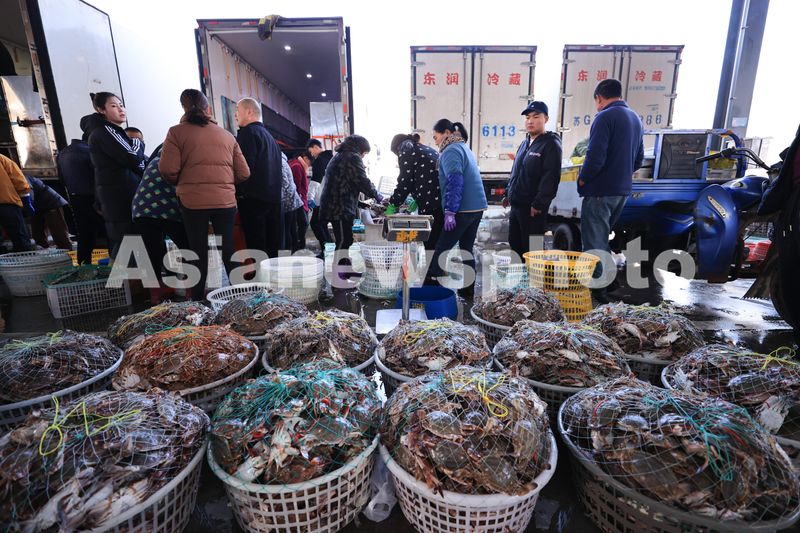 图片说明:2024年10月24日,在江苏省连云港市赣榆区海头镇海产品交易市场,渔民在分拣鲜活梭子蟹。