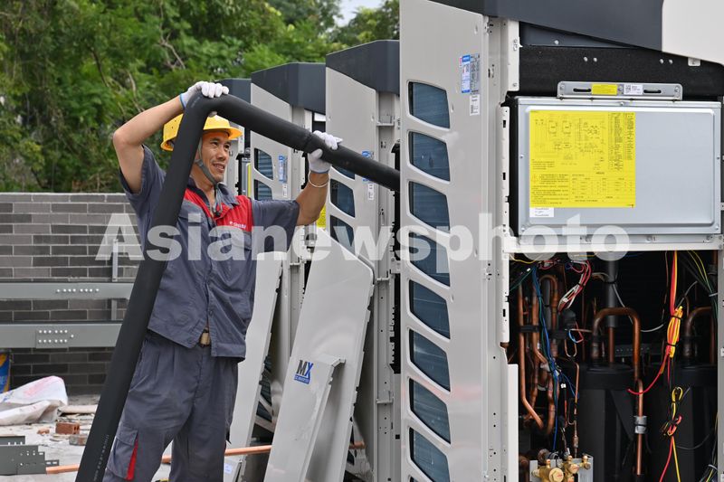2024年10月24日,重庆市沙坪坝区磁器口凤凰山城市更新项目,工人正在安装空调系统。