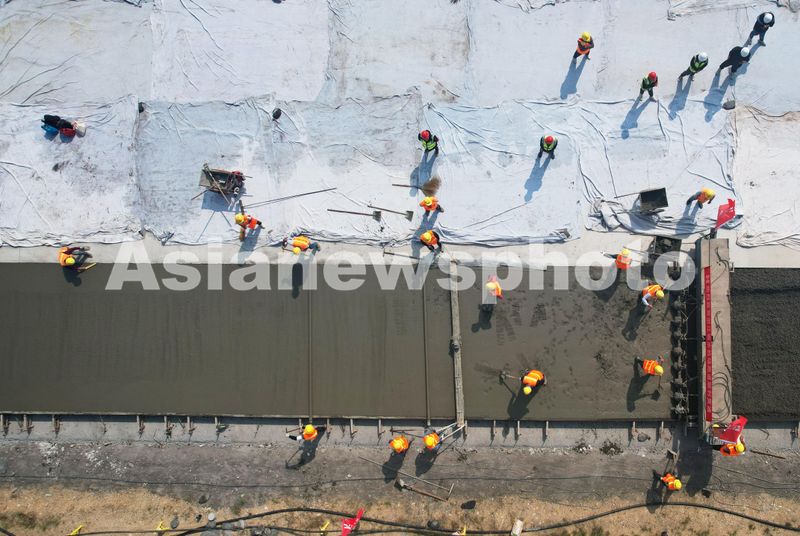 图片说明:2024年10月24日,施工人员在浙江丽水机场飞行跑道最后一片施工区域进行跑道混凝土铺平作业。