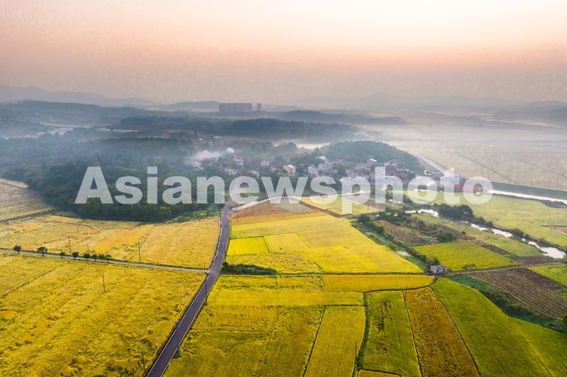 图片说明:2024年10月24日,江苏省南京市溧水区晶桥镇笪村,金黄的稻田与整齐的村落构成一幅美丽画卷,稻田飘香丰收在望。