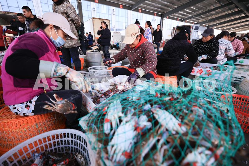 图片说明:2024年10月24日,在江苏省连云港市赣榆区海头镇海产品交易市场,渔民在分拣鲜活梭子蟹。