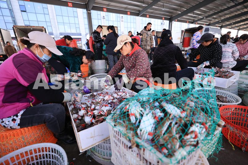 图片说明:2024年10月24日,在江苏省连云港市赣榆区海头镇海产品交易市场,渔民在分拣鲜活梭子蟹。