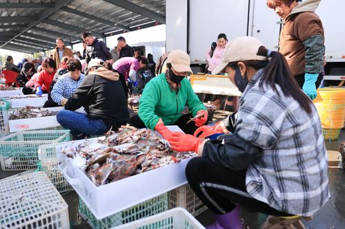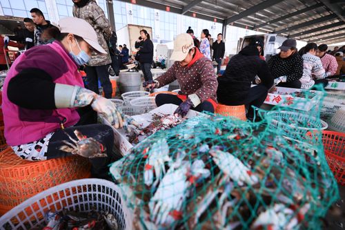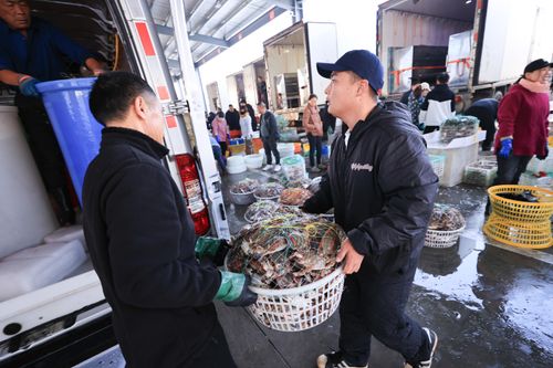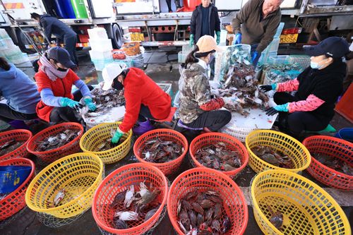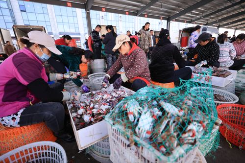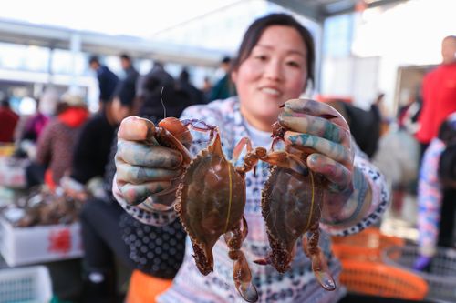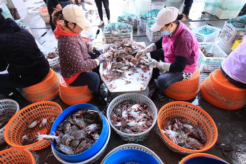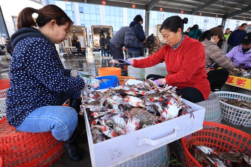 图片说明:2024年10月24日,在江苏省连云港市赣榆区海头镇海产品交易市场,渔民在分拣鲜活梭子蟹。