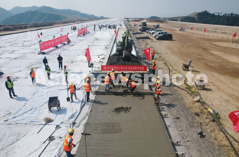 图片说明:2024年10月24日,施工人员在浙江丽水机场飞行跑道最后一片施工区域进行跑道混凝土铺平作业。