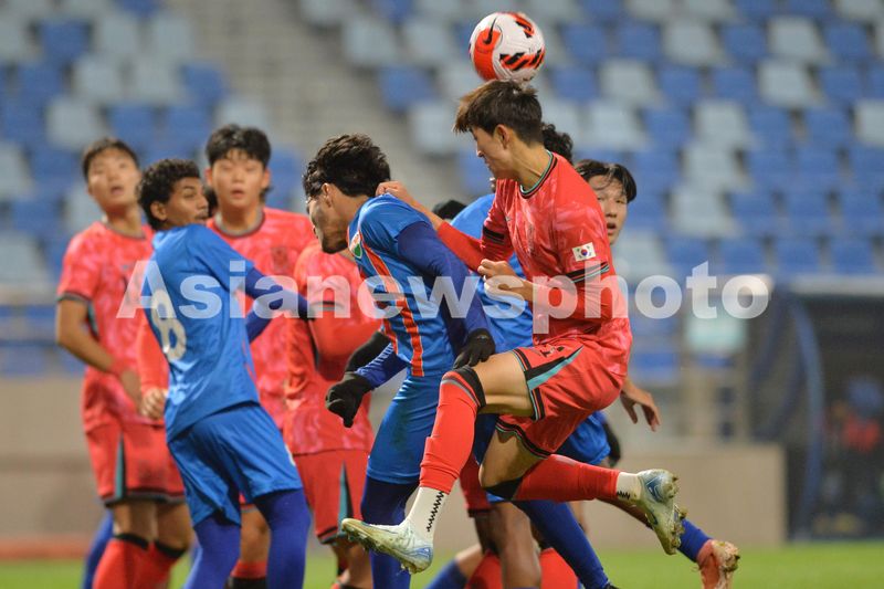 2024年10月23日,身着红色球衣的韩国球员与马尔代夫球员在大连足球青训基地足球场上拼抢。当晚,在大连足球青训基地体育场进行的2025亚足联U17亚洲杯预选赛C组赛第三轮,韩国队以13-0大胜马尔代夫。