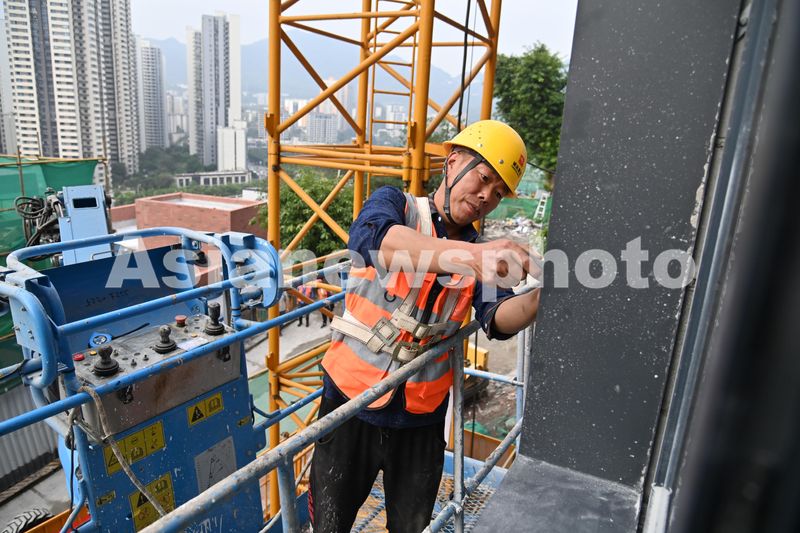 2024年10月24日,重庆市沙坪坝区磁器口凤凰山城市更新项目,工人正在进行建筑外立面施工。